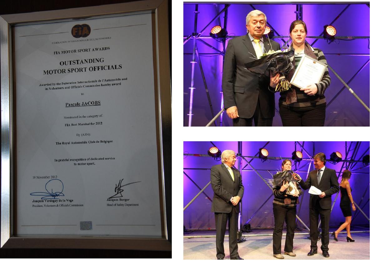 Tijdens de « RACB Awards 2012 » werden de standcommissarissen in de eerbetuigingen betrokken. Inderdaad, Pascale Jacobs werd door de FIA een diploma uitgereikt als « Outstanding Official of the Year 2012 ». Zelfs als slechts één persoon werd beloond, is het onze functie die wordt erkend en gewaardeerd en dit is het resultaat van het werk van alle standcommissarissen. Meer nog, deze « award » werd als voorlaatste van de plechtigheid uitgereikt, vlak voor de bekendmaking van de Kampioen van Belgie, een bewijs van de belangrijkheid van onze functie als commissaris tijdens autowedstrijden voor onze Nationale Federatie, RACB-Sport. Om de foto's te bekijken, klik HIER.